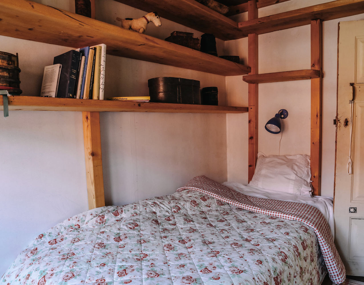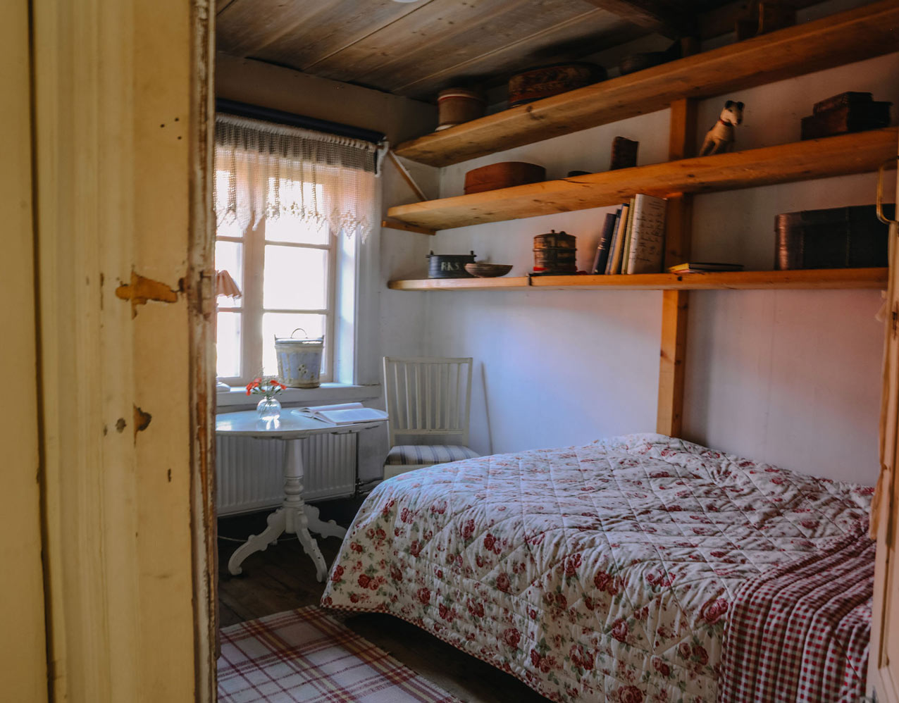 Pigkammaren är ett litet litet rum i Gammelstugan med en dörr som går att stänga. I rummet finns ett fönster som vetter mot baksidan av gården, en 90 cm bred säng samt ett mindre skrivbord och stol.