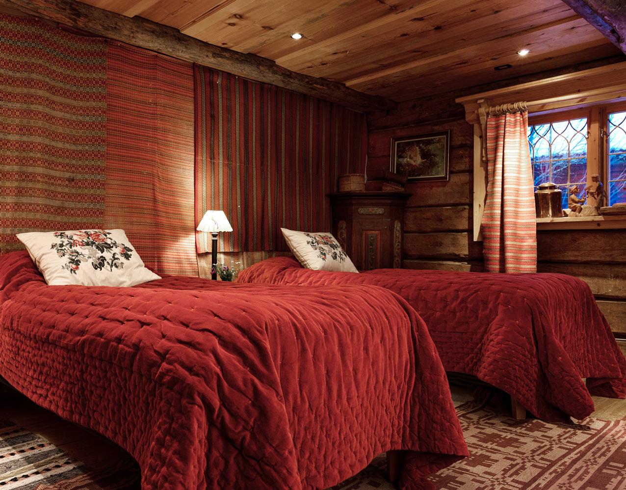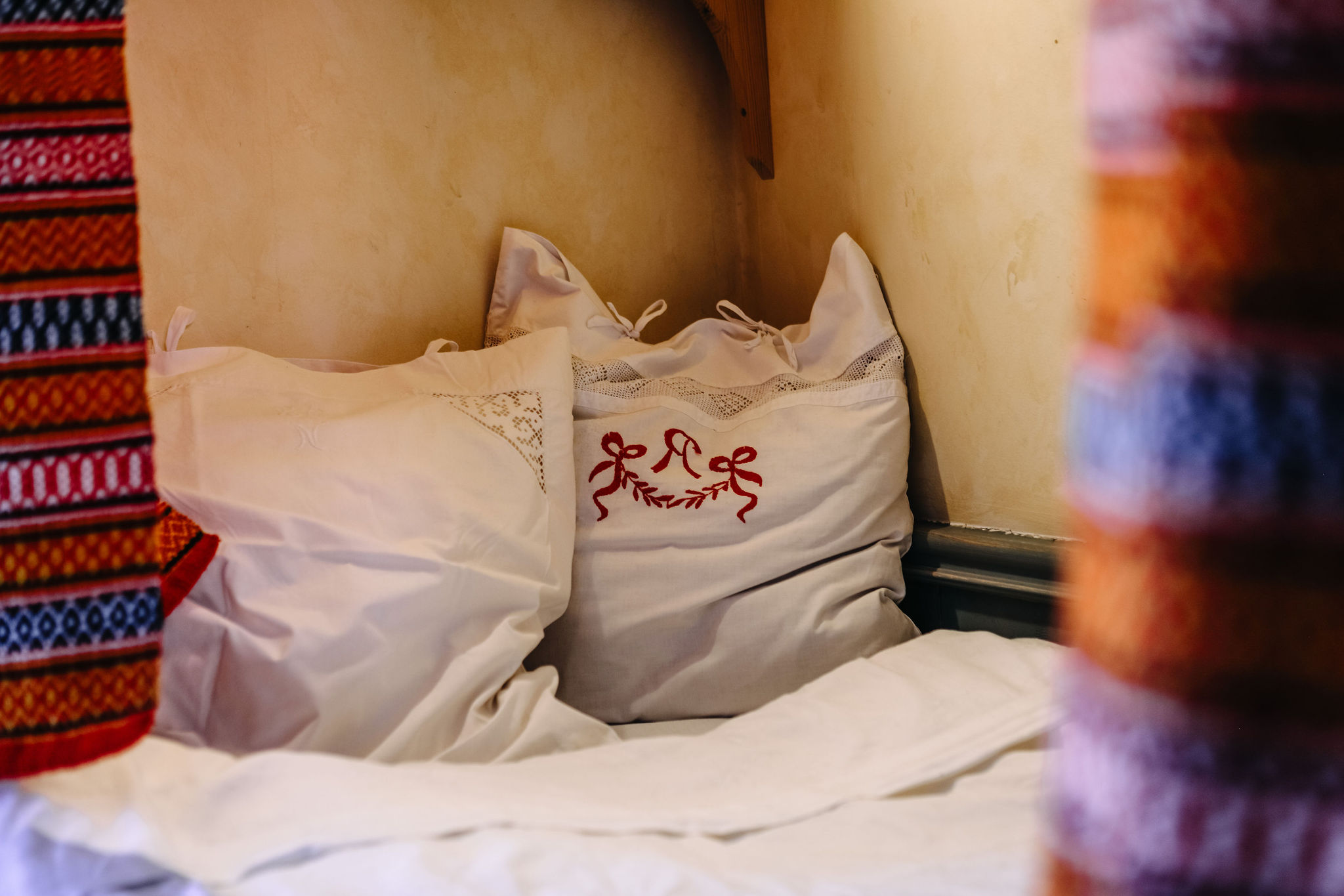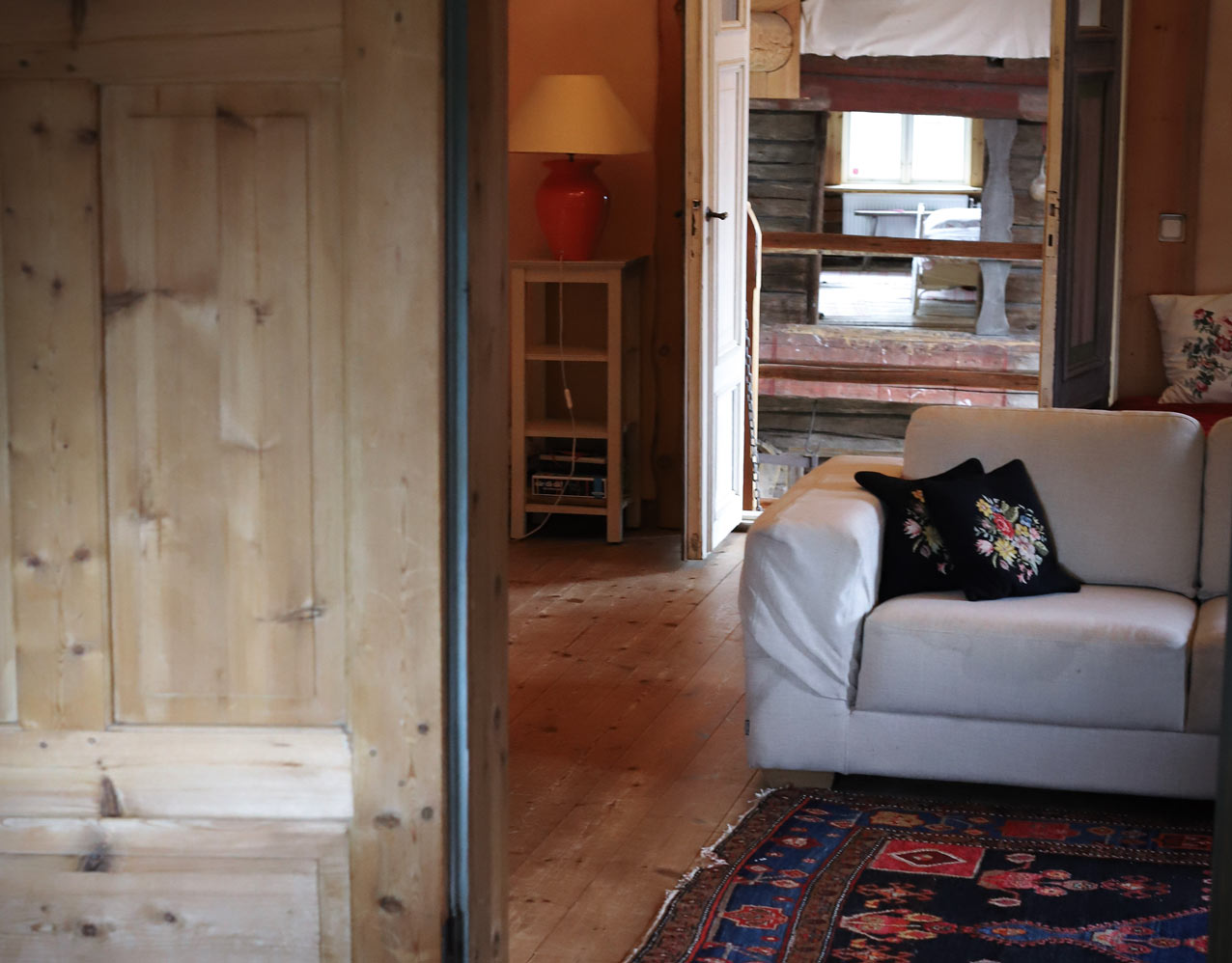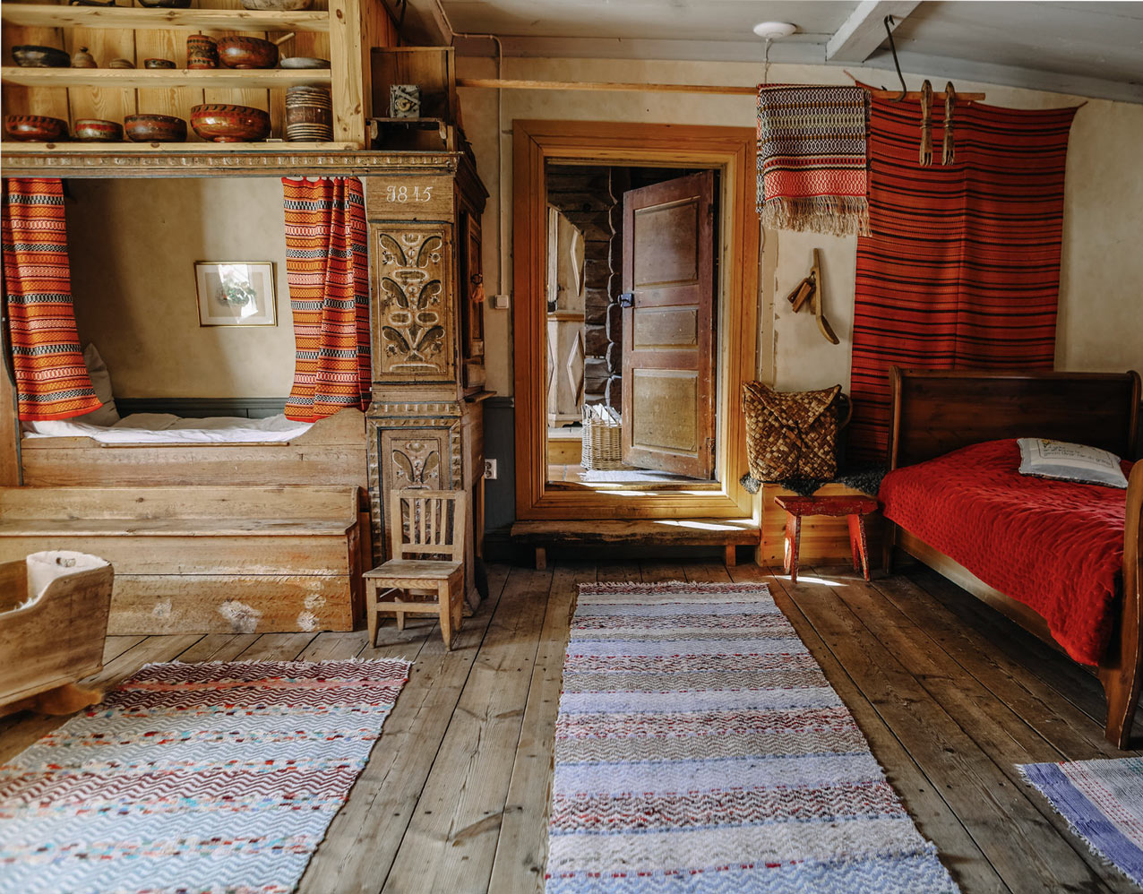 Orsarummet ligger i det huset vi plockade ned från Lima. Här finns en rymlig säng och toalett.Och självklart med massor av allmogeföremål.