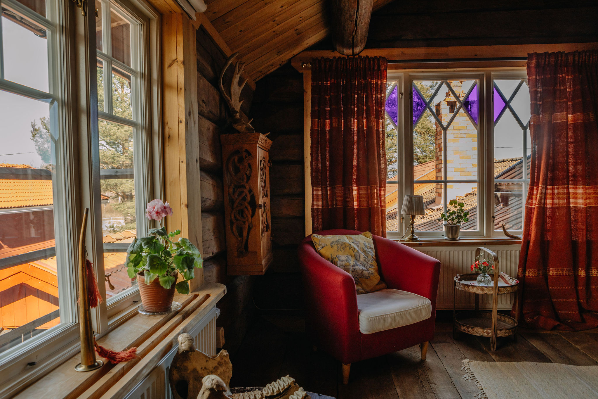 Prinsessrummet ligger på övrevåningen i det timmrade lofthärbret från 1884. Genom en smal smal trapp kan du...