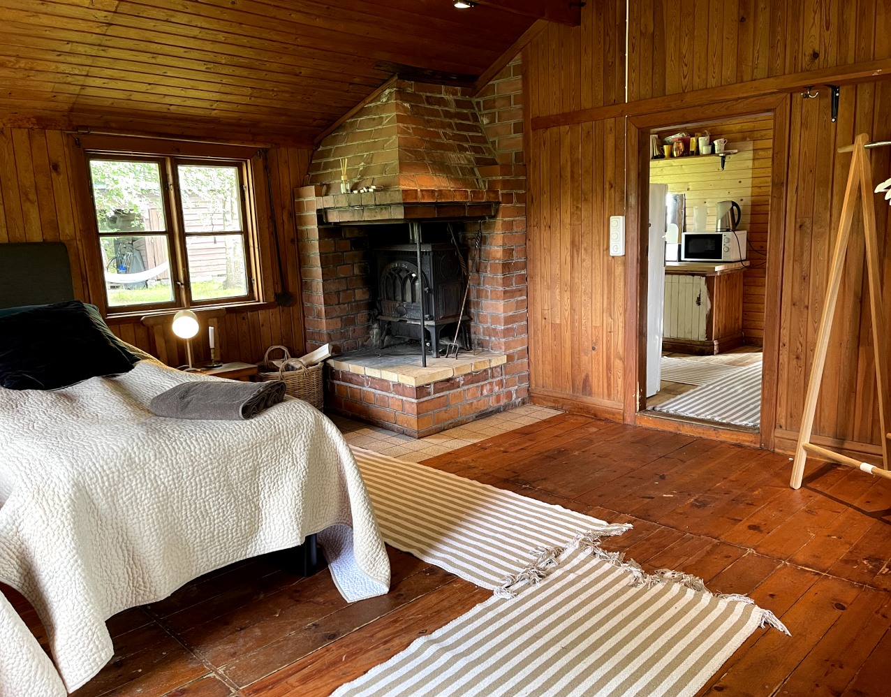 Här finns 3 sängar. En härlig eldstad. Här bor man på sommaren...